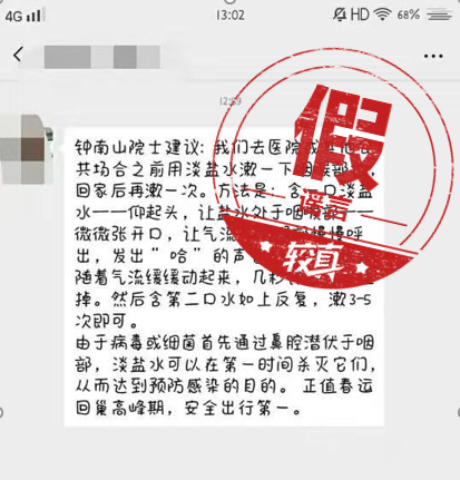 较真判定:不靠谱,淡盐水杀不死冠状病毒