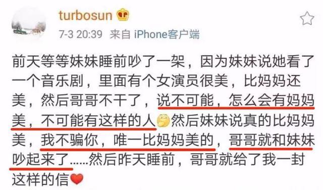 某天,孙俪在交际网站上晒出了儿子等等和女儿小花的"吵架"记载,大致内容是妹妹小花看了一部音乐剧,然后表明觉得音乐剧的女演员是仅有一个比自己妈妈美观的人,可是哥哥等等却不干了,而且表明不可能,后来还给妈妈写了一封信。他在信中表明:妈妈你是这样一个世界上最美丽的人,妈妈我喜爱你。不仅如此,还在最终加了一个爱心。