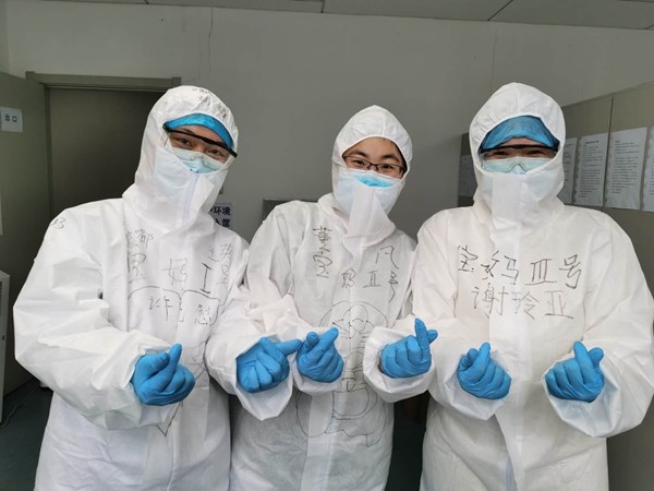 3月7日,武汉大学人民医院东院,几个90后护理宝妈身着防护服为武汉加油打气。由于疫情,这些宝妈不得不脱离年幼的孩子奔赴一线,他们是无畏的兵士,更是温顺的妈妈。