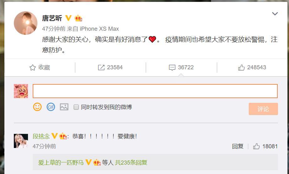 最近许多明星相继产子,这可谓是好音讯不断,这不唐艺昕也来凑热闹了,她在微博供认自己现已怀孕。唐艺昕经过微博发文宣告怀孕喜讯。她在博文中写道:“感谢咱们的关怀,确实是有好音讯了。 疫情期间也期望咱们咱们不要放松警觉,留意防护。”