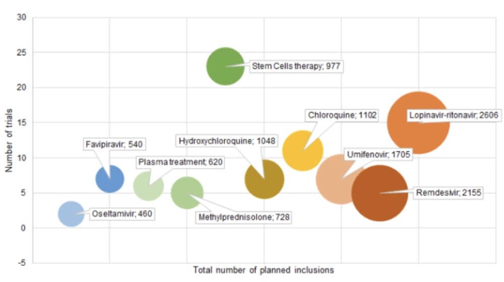 从评价疗法的数量来看,最常用的是干细胞疗法,到达23项、洛匹那韦/利托那韦疗法15项、氯喹和羟氯喹分别为11项和7项、阿比朵尔9项、血浆医治7项、法匹拉韦7项、甲基泼尼松龙和瑞德西韦各5项。