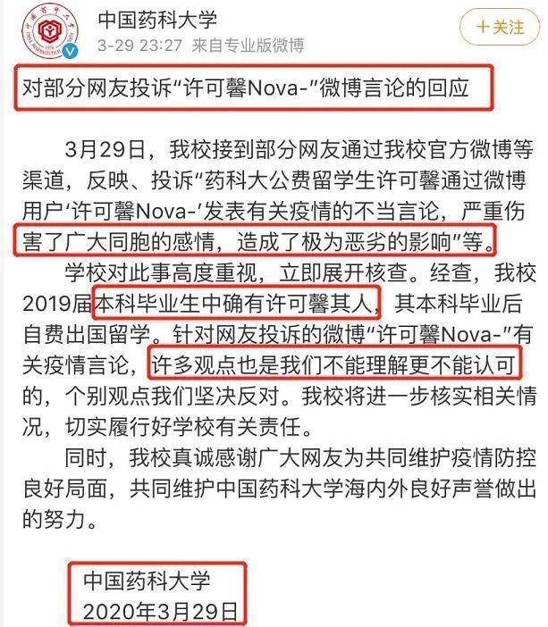 答应馨的言辞乃至让最初的母校我国药科大学无辜被拖累,校园官方微博等途径,被网友们纷繁留言,校园标明态度:关于留学生答应馨关于疫情的不妥言辞,许多观念不认同,单个观念坚决对立,该名学生不是公费留学,是自费留学。