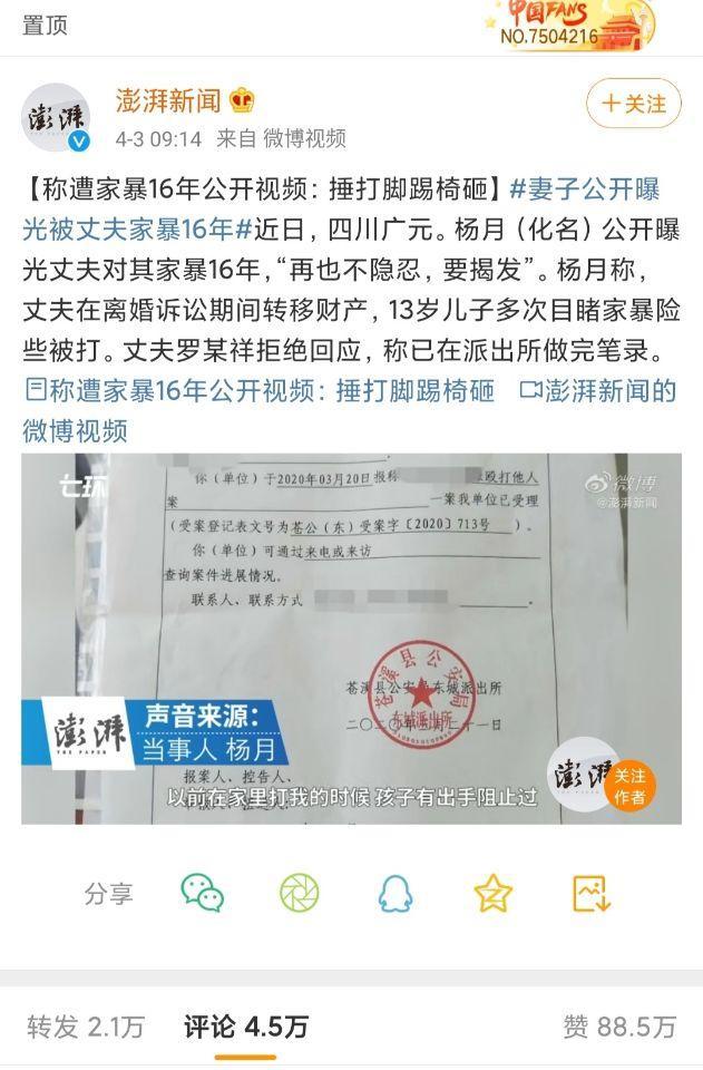 今天在微博上看到了一条热搜:四川广元一女子杨某,曝光自己的老公对自己进行了长达16年的家暴,而且在家暴期间,13岁的儿子曾多次亲眼目击了她被老公家暴的进程。