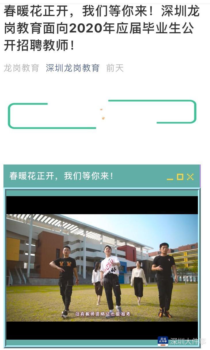 “不管你来自哪里,来龙岗展示实力,Show出你的技艺”“近3万名专业教师陪你一起生长”“空闲的你还可以去红立方和大芬油画村,没错CBA和中超早就在龙岗这扎根”……在龙岗区教育局官方微信发布的招聘推文中,一段说唱视频以轻捷的节奏,首先向考生们发出到龙岗教育来的约请。