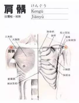 在臂外侧,三角肌上,臂外展,或向前平伸时,当肩峰前下方向凹陷处。